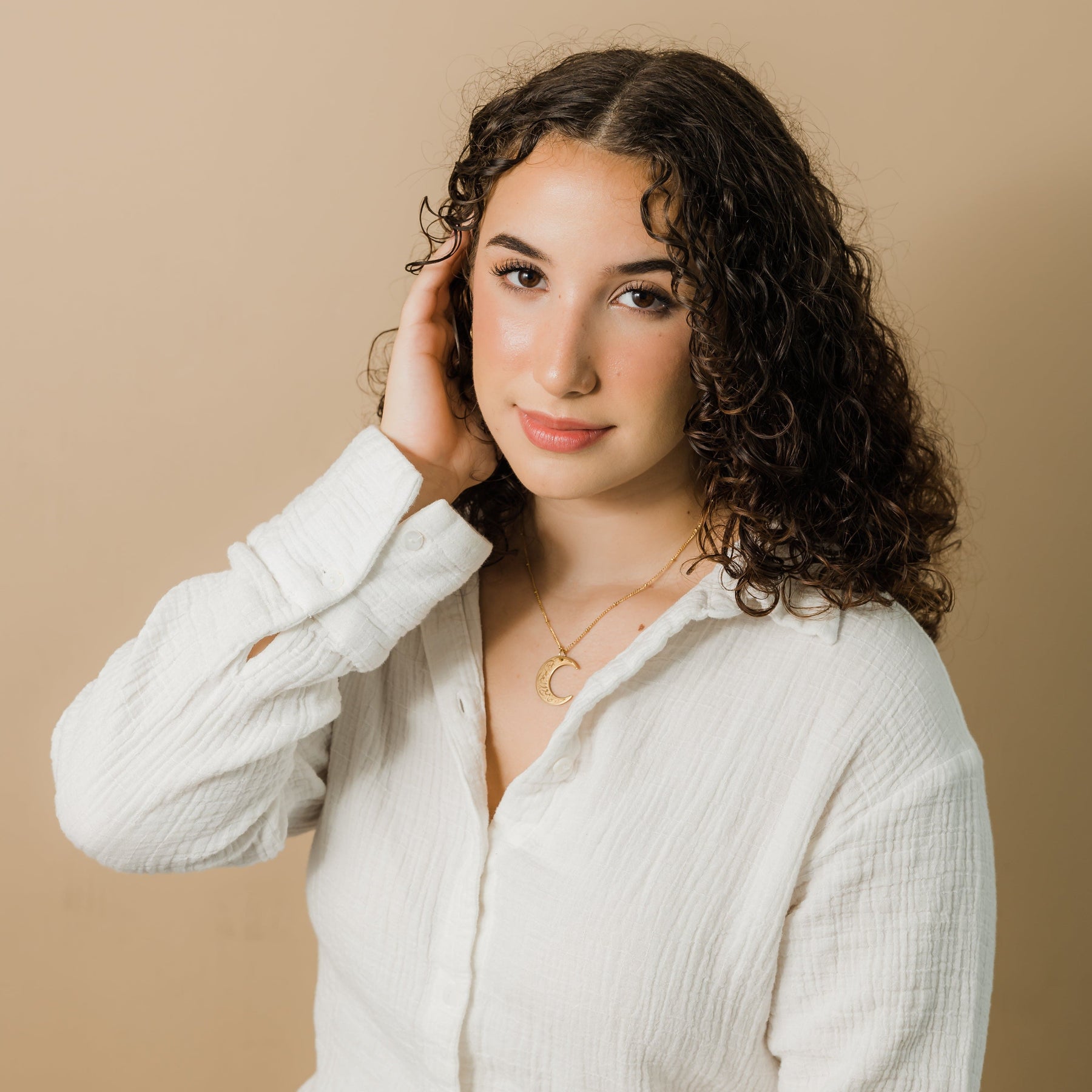 Model is wearing her necklace at 18.