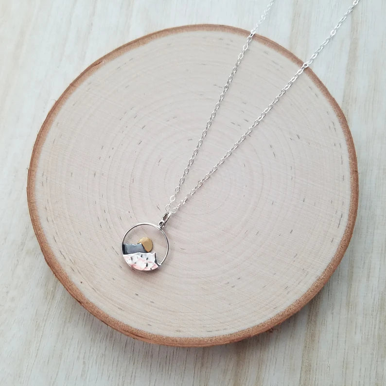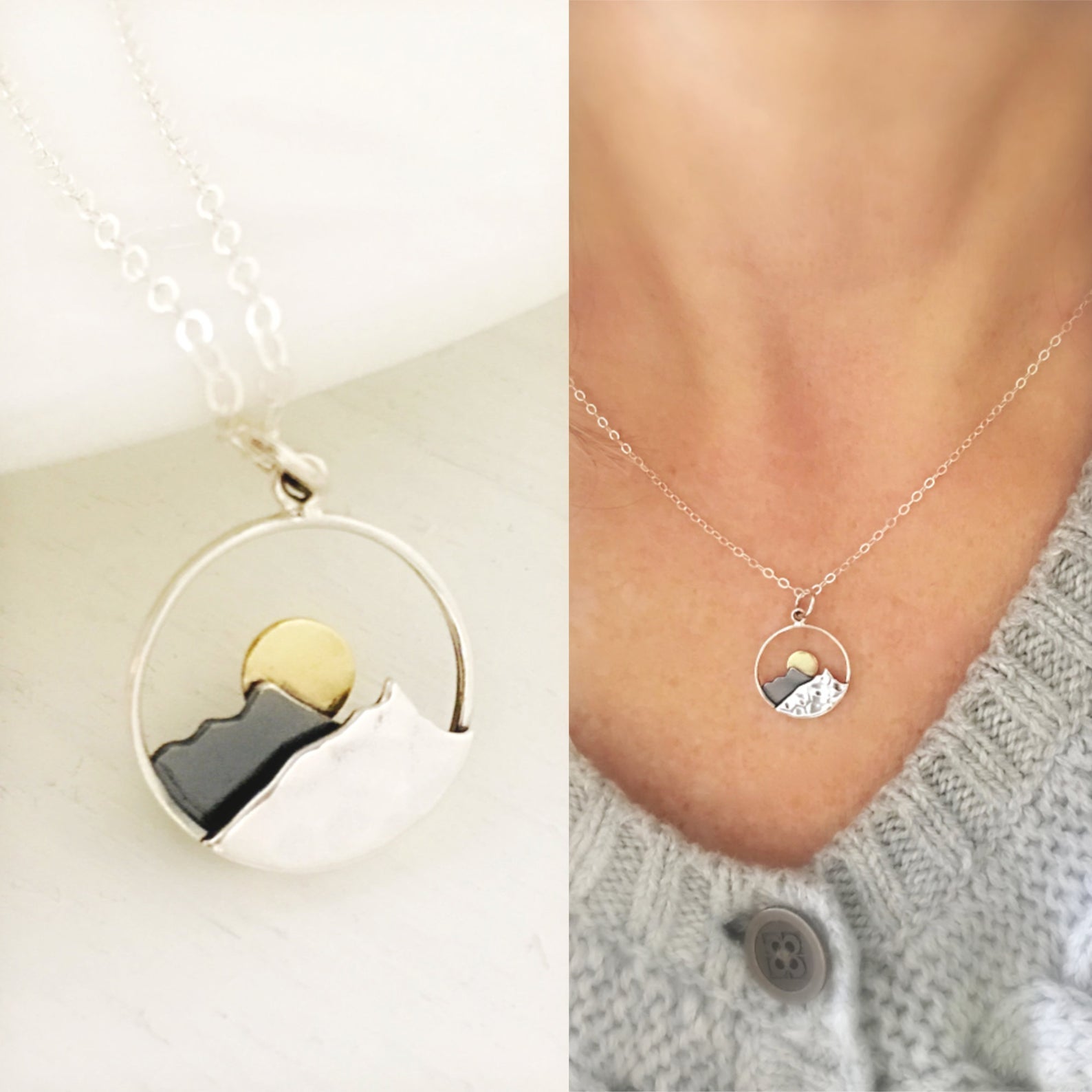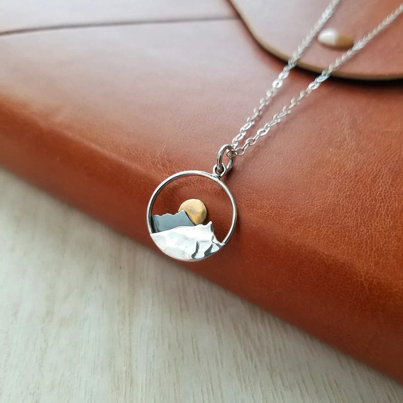 Inspired from our love of nature, this mountain necklace will remind you of your favorite place. Layers of durable alloy mountains with a glowing sun peeking out. This necklace is perfect for anyone who loves to ski, hike, camp or just enjoys the great outdoors.