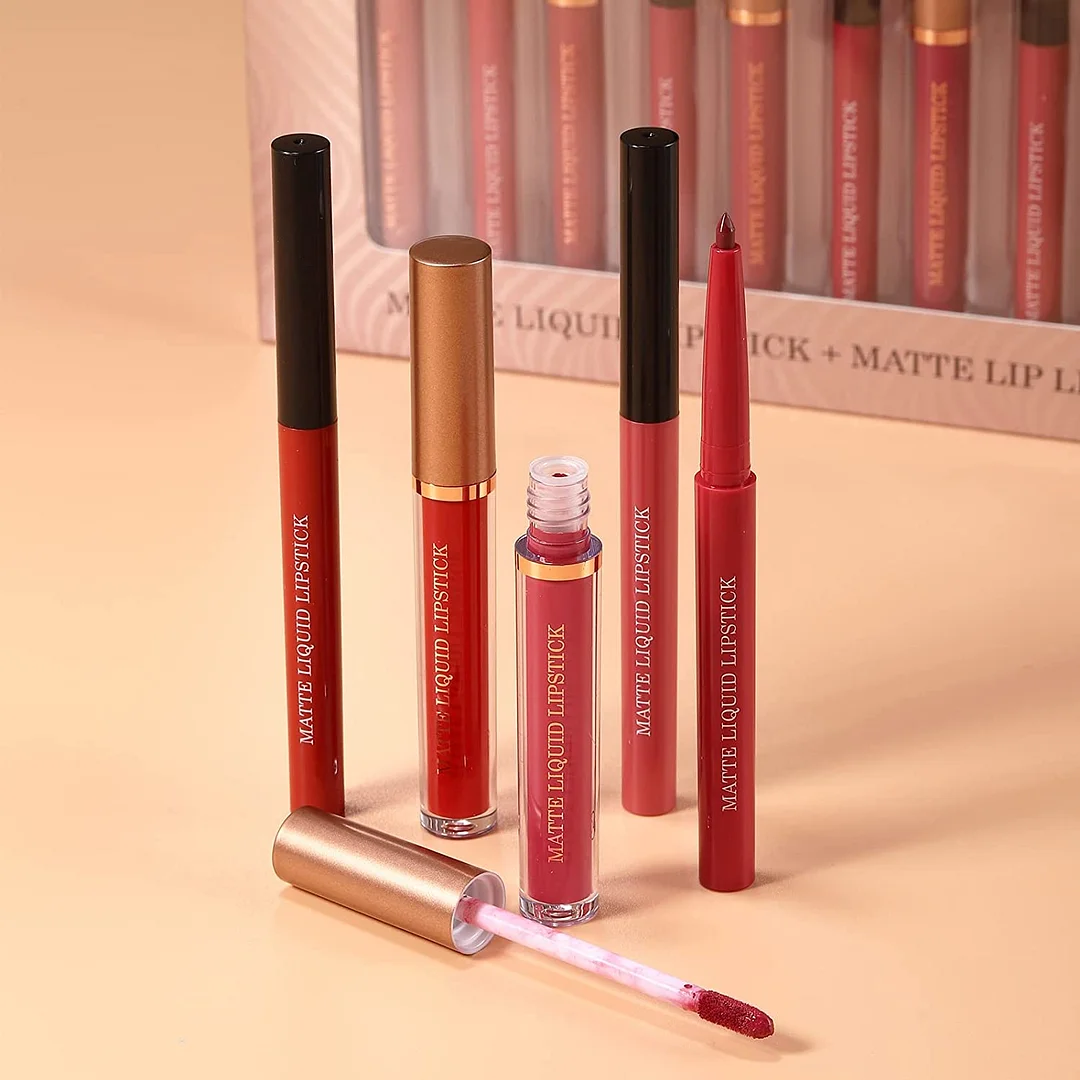 - ★6 colorful Matte Liquid Lip Sticks and 6 Lip Liner Pens makeup kits one step gives your lip a full, sensuous full of temptation. formulated with a luxurious, true matte finish, soft like the silk Long-lasting and waterproof, hard to fade, not stick cup, fog surface velvet effect.