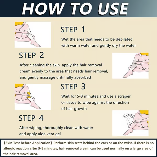 Formulated with Aloe Vera and Vitamin E, our cream works deeply to remove hair closer to the root, ensuring a smoother result in just 8 minutes ⏳. It’s gentle and effective, especially for sensitive areas.