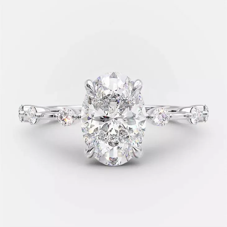 A one of a kind oval engagement ring.A stunning oval diamond set on a unique & delicate diamond studded band. Handcrafted.