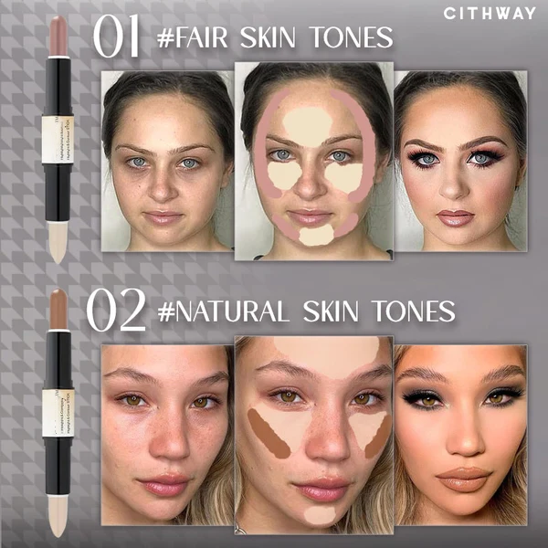 This magic makeup stick provides a creamy, easily blendable formula that helps you sculpt, highlight or conceal in seconds. It glides smoothly and applies like a dream totally mess-free on any skin types, including on oily skin, dry skin, combination, natural, and sensitive skin. The double-ended highlighting-contouring stick comes in 3 color combination selections that can flatter and blend for all skin complexions. Available for fair skin tones, natural skin tones, and those with darker skin tone young girls and ladies. Simply apply both shades accordingly on your features that need to conceal, contour, and accentuate, blend it with a blush, and you're all good.