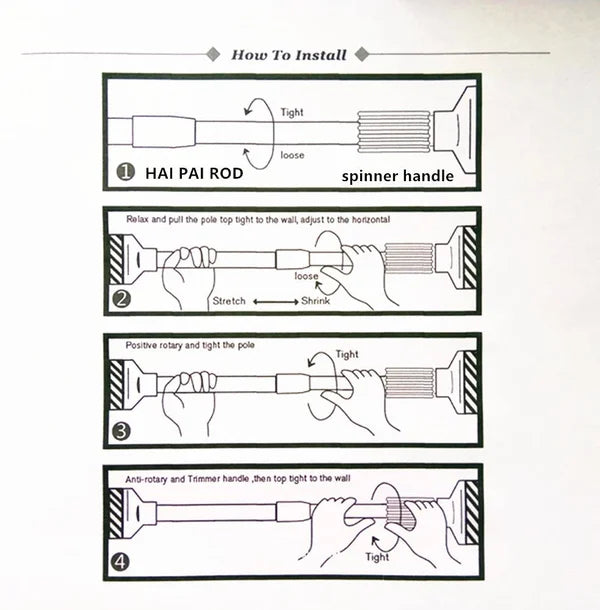 A:Â The extension part of the Tension Rod rotates out. After it is suitable for your own use length, the delay part is compressed in the opposite direction.