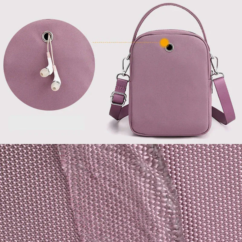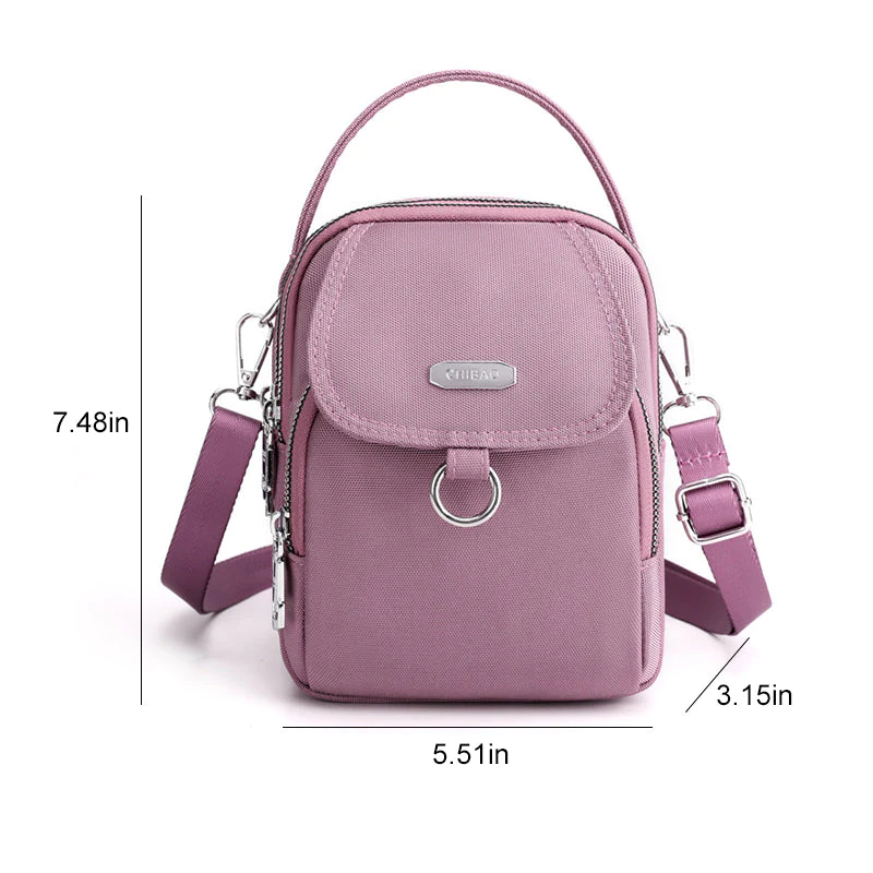 Material: The shoulder bag is made of quality nylon which makes it durable and water-repellent. Lining is polyester. The capacity of the bag is large enough for wallet, cell phone, keys, and other small stuffs.