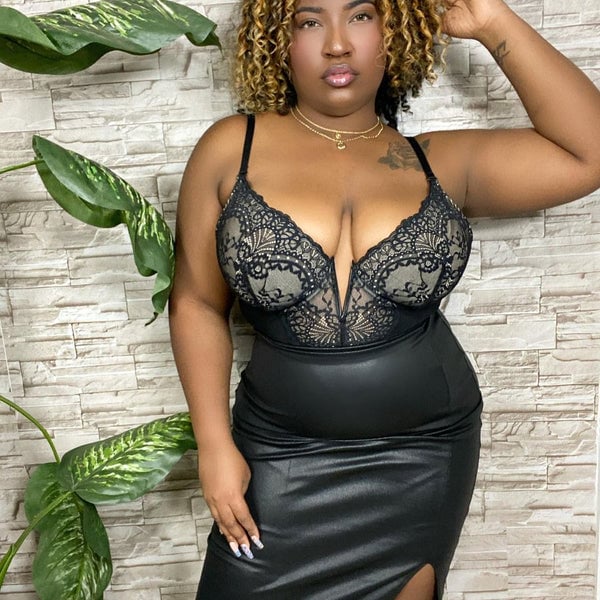 • Deep-V neck detail and delicate lace-designed bodysuit.