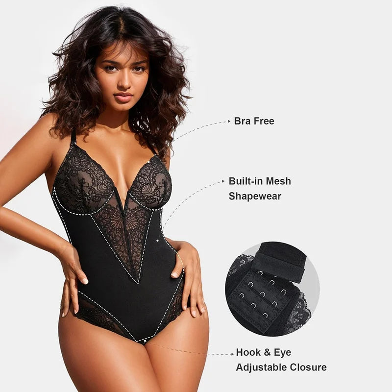 🔥EARLY CHRISTMAS SALE 49% OFF 🏆#1 Bestselling🏆 - Romanticpeach™ Deep-V Neck Lace Thong Bodysuit